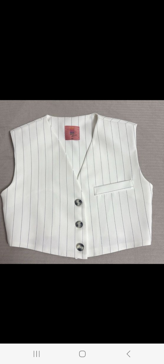 Düğmeli, çıtçıtlı, yakalı ve çizgili beyaz yelek. Sentetik kumaştan, midi boy, düzenli kesim. Ofis ve günlük iş stiline uygun.