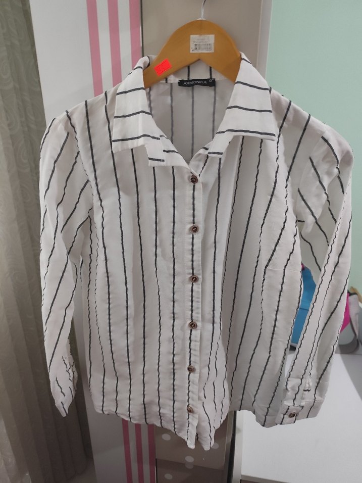 Gri çizgili beyaz gömlek, düğmeli, uzun kollu ve yakalıdır. Rahat kesimiyle günlük kullanıma uygundur.