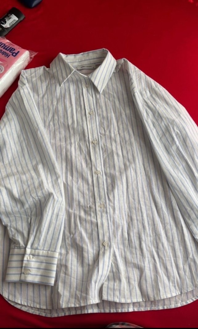 Uzun kollu, düğmeli, yakalı beyaz keten gömlek. İnce gri çizgilerle sade ve ofis kullanımı için uygun, rahat kesim.