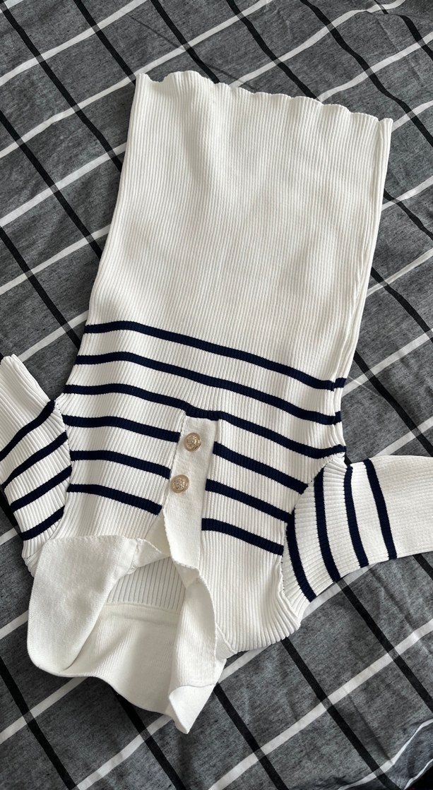 Düğmeli, uzun kollu, boğazlı beyaz triko kazak. Lacivert çizgili ve midi boyda, günlük sokak stili için uygun esnek kumaş .
