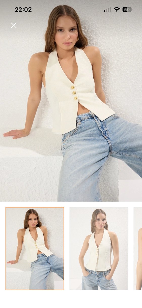 Beyaz renkte, düğmeli ve V yakalı denim kumaştan yapılmış, regular fit ve midi boy kadın yelek. Günlük kullanıma uygun.