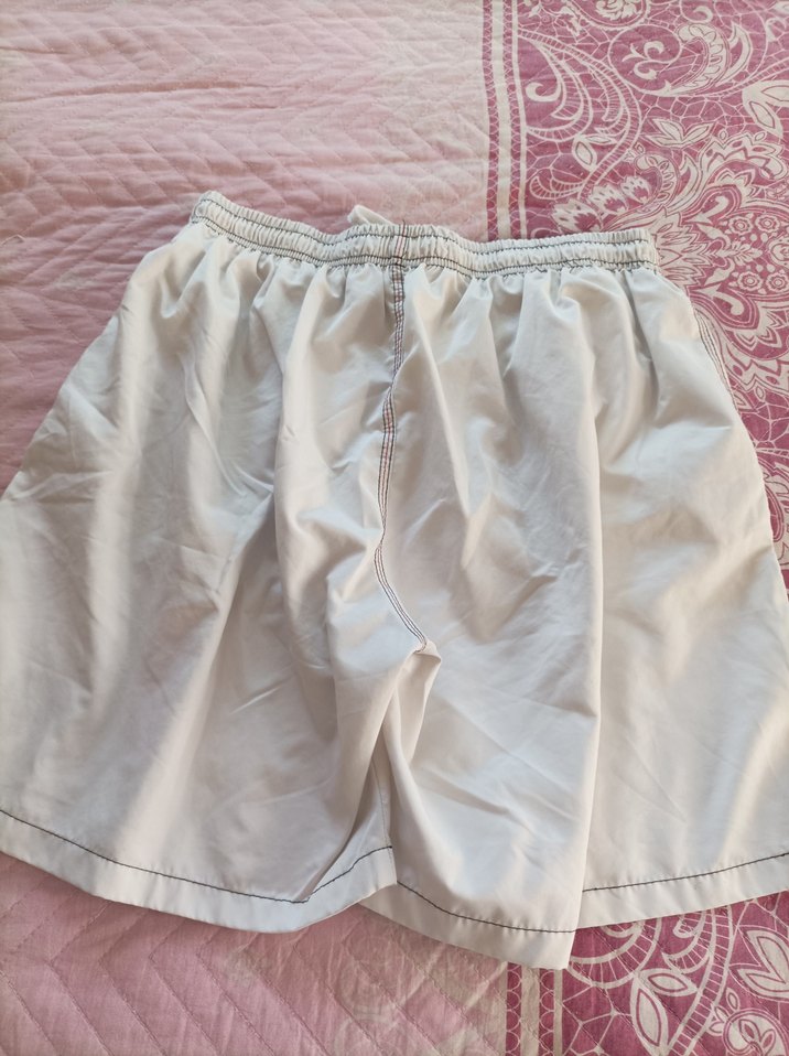 Düğmeli detaylara sahip, yumuşak sentetik kumaştan yapılmış beyaz, bol kesim erkek mini şort. Plaj ve günlük sokak stiline uygun.