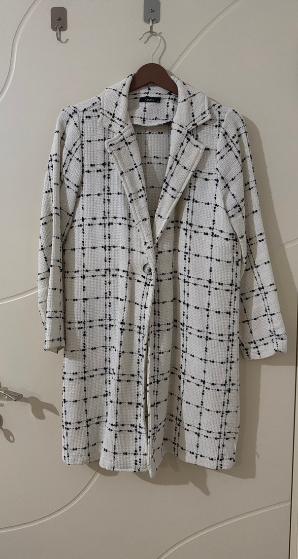 Düğmeli, uzun kesim beyaz ekose kadın kaban, notched lapel yakalı ve uzun kolludur. Sentetik kumaştan üretilmiş, günlük sokak tarzı için uygundur.