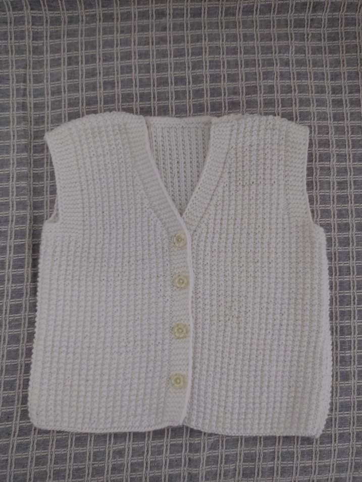 Düğmeli, beyaz örgü süveter, kolsuz ve tek renk. Normal boyda, tekne yaka ve günlük kullanıma uygun.
