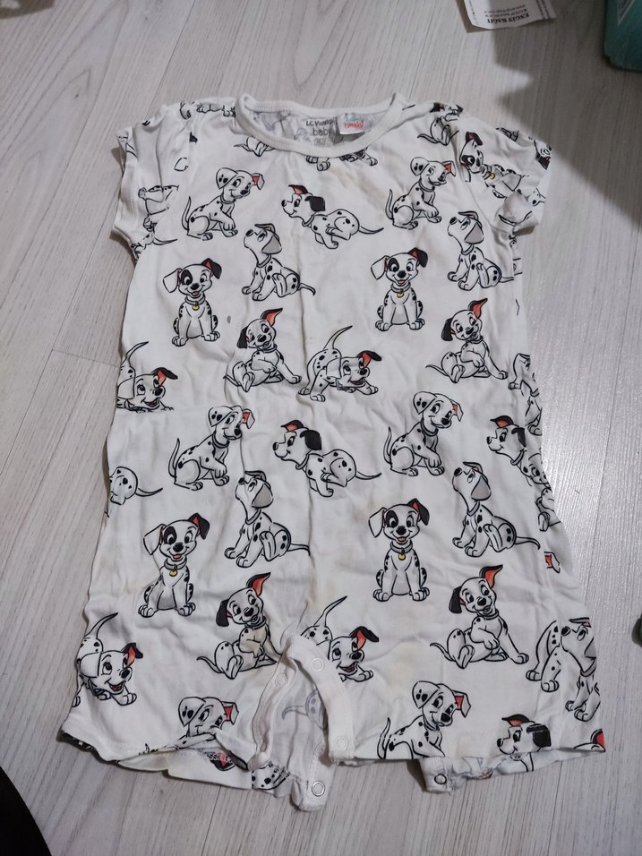 Düğmeli, beyaz zemin üzerine köpek desenleriyle süslenmiş erkek bebek tulumu. Rahat ve günlük sokak stili için uygundur.
