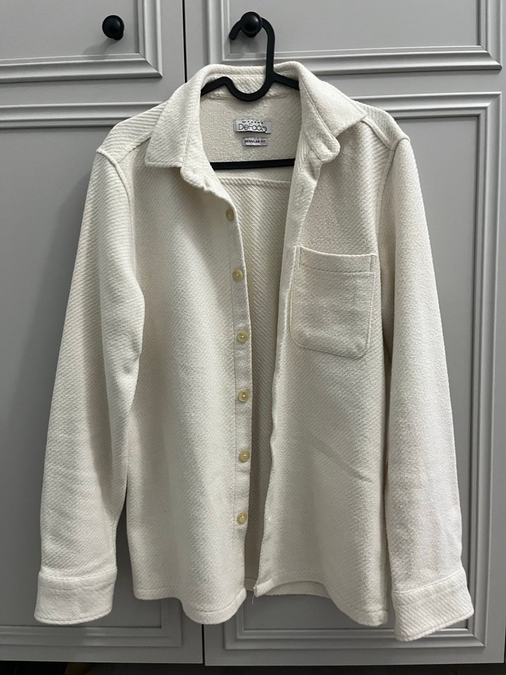 Beyaz pamuklu erkek ceketi, düğmeli ve yakalıdır. Uzun kollu, regular fit ve gündelik sokak stili için uygundur.