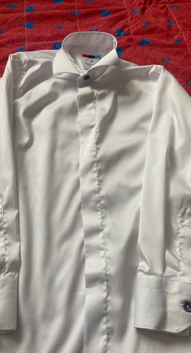 Düğmeli, beyaz, notalı yakalı erkek gömlek. Uzun kollu, parlak sentetik kumaş ve normal kesim, ofis için uygun.