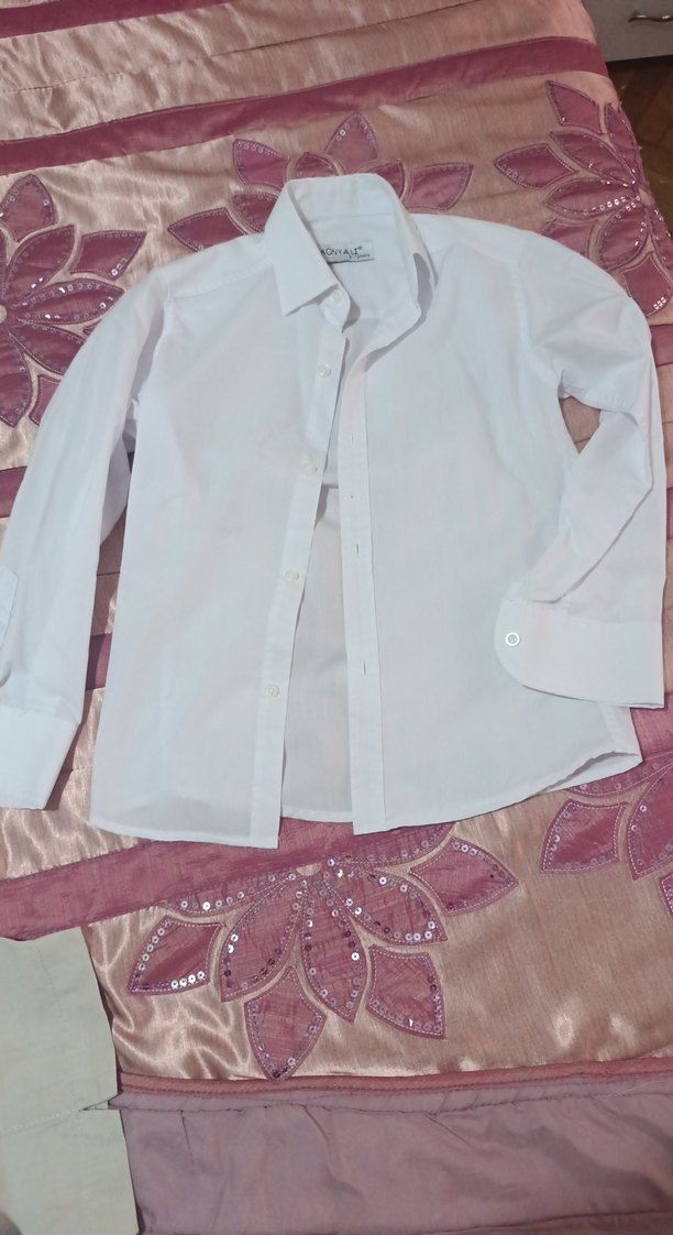 Uzun kollu, yakalı ve düğmeli beyaz erkek çocuk gömleği. çok az giyildi. sadece üçüncü fotoğraftaki minik bir kırmızı leke var ama hiç belli olmuyor