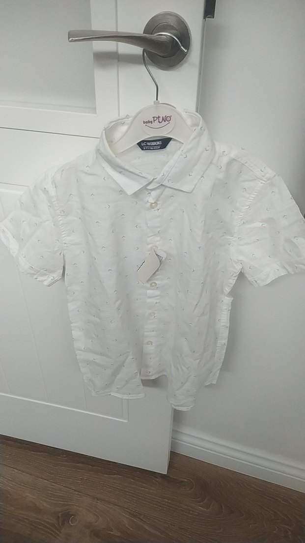 Pamuklu, düğmeli ve yakalı beyaz erkek çocuk gömleği, kısa kollu ve bol kesim olarak tasarlanmıştır. Sokak stiline uygun basit bir modeldir.