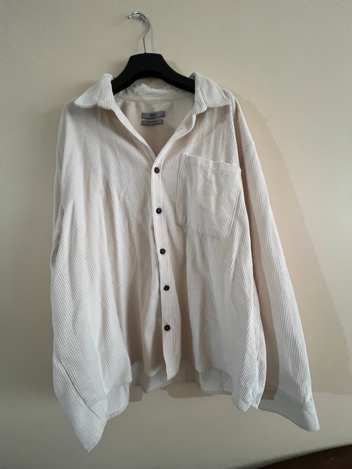 Düğmeli, kadife , beyaz, uzun kollu, normal boy, salaş kesim kadın gömlek. Notch yakalı ve cep detaylı, günlük rahat kullanım için uygundur. Ürün hiç giyilmedi