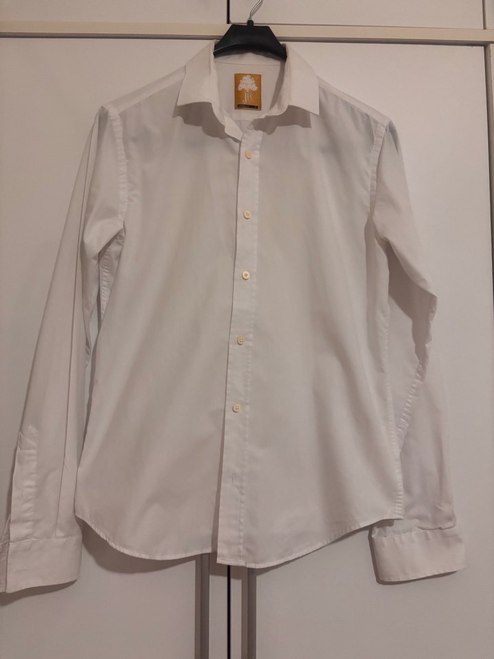 Pamuk kumaştan yapılmış, yakalı ve düğmeli beyaz erkek gömleği. Uzun kollu ve regular fit kesime sahip, iş ortamına uygundur.
