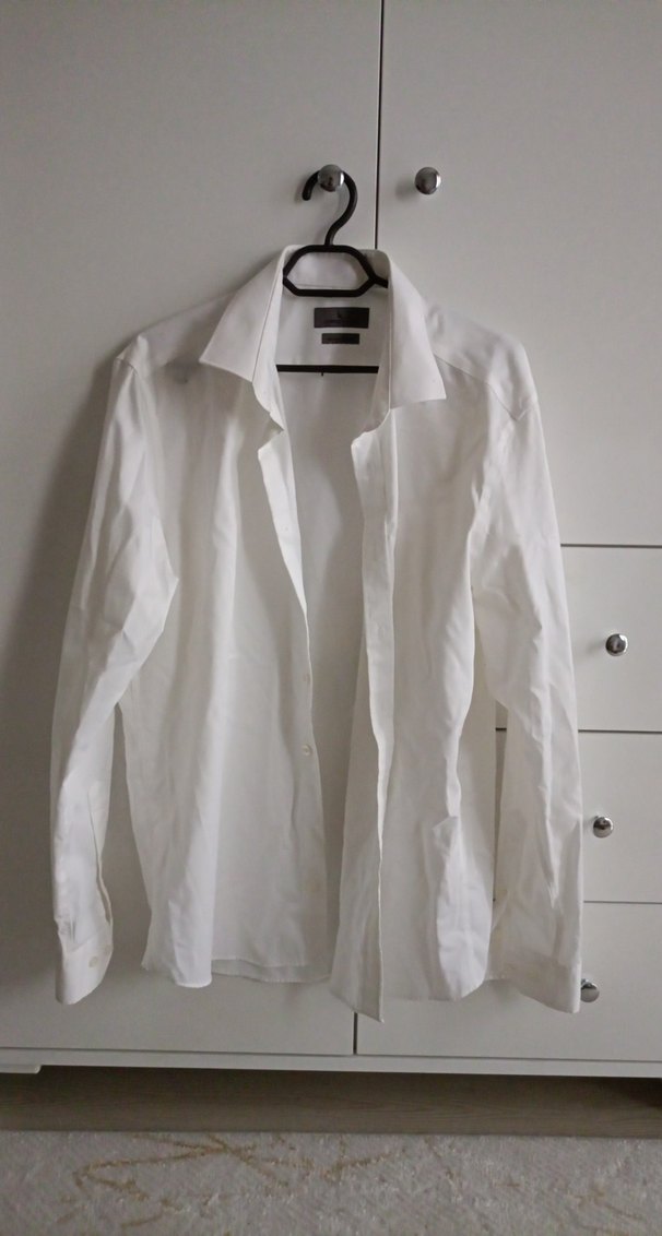 uzun kollu beyaz erkek gömlek. Ofis ve günlük kullanıma uygun, normal kesim ve uzunlukta.