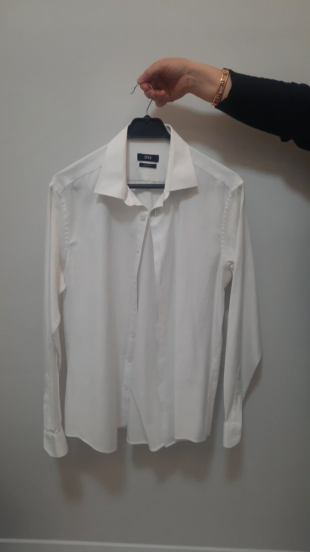 Düğmeli, yakalı ve uzun kollu beyaz erkek gömleği. Parlak görünümlü, sentetik kumaştan, ofis ve günlük kullanıma uygun.
