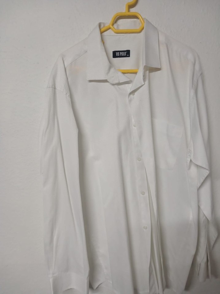 Düğmeli beyaz erkek gömlek, yakalı ve uzun kolludur. dar kesim ve minimalist tasarıma sahiptir. Ofis kullanımı için uygundur ve sentetik kumaştan yapılmıştır.