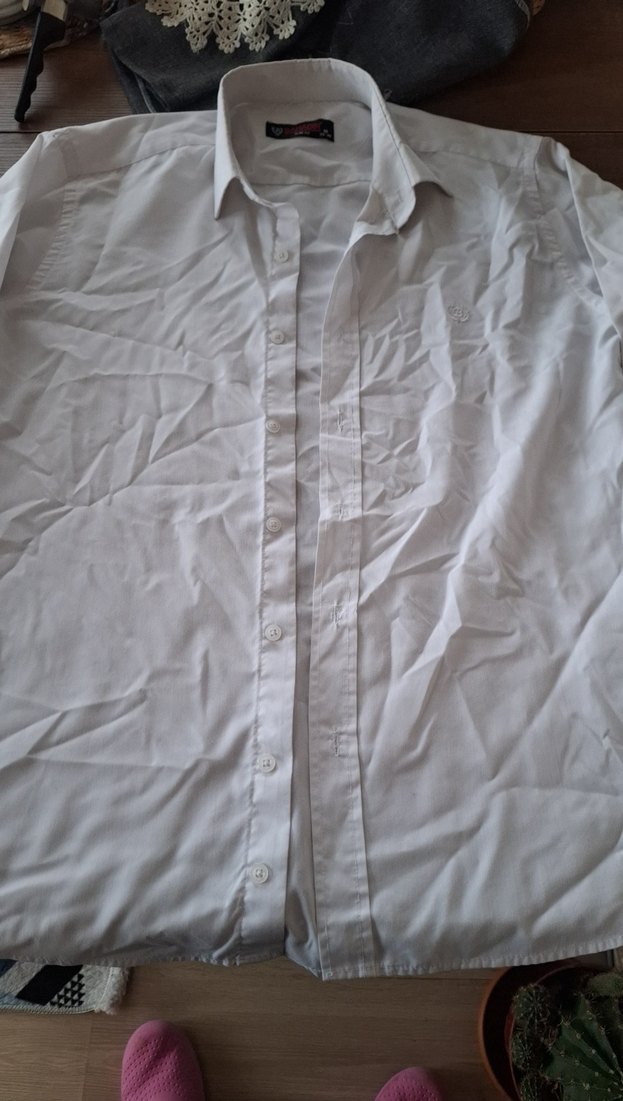 Beyaz ,düğmeli ve uzun kollu erkek gömleği. Slim fit kesimi ve yakalı tasarımı ile ofis için uygun. Herhangi bir deformesi yoktur.