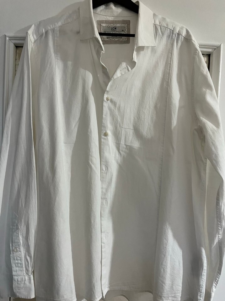 Düğmeli, uzun kollu, yakalı ve bol kesim beyaz erkek gömleği. Ofis kullanımı için sade tasarım.