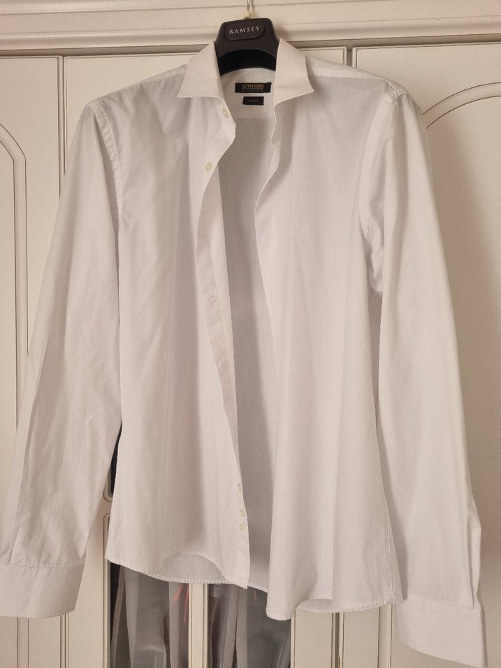 Düğmeli, keten kumaştan yapılmış, beyaz renk, normal boyda, uzun kollu, yakası kesimli erkek gömleği. İş ve günlük kullanıma uygundur.