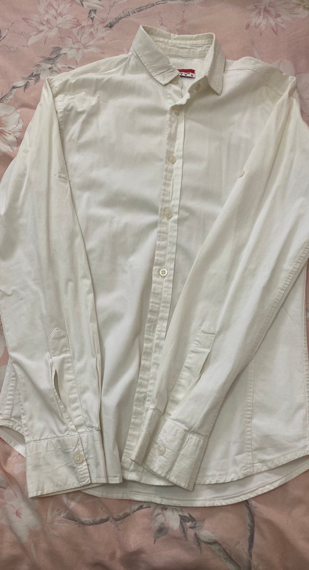 Beyaz keten erkek gömlek, düğmeli ve uzun kolludur. Yakalı, düz ve normal kesimdir. Günlük rahat sokak stili için uygundur.