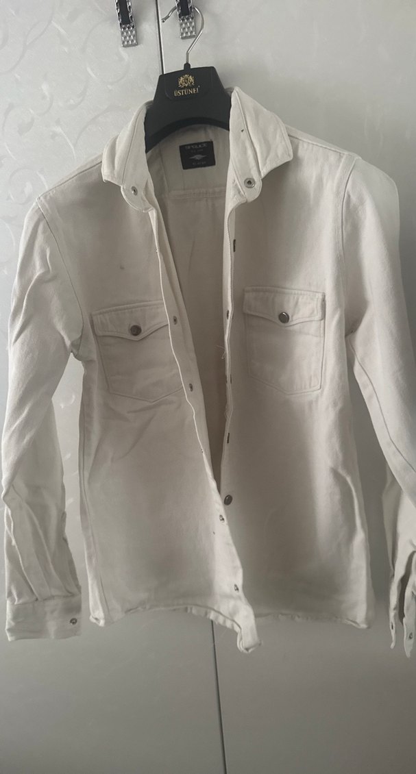 Beyaz keten erkek gömlek, uzun kollu ve düğmeli. İki cep ve notched lapel yakaya sahip, rahat kesim, gündelik sokak stili için uygun.