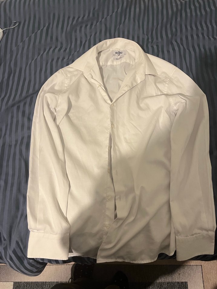 Düğmeli, yakalı ve uzun kollu erkek keten gömlek. İnce dokusu ve beyaz rengiyle ofis ve sokak stiline uygun.