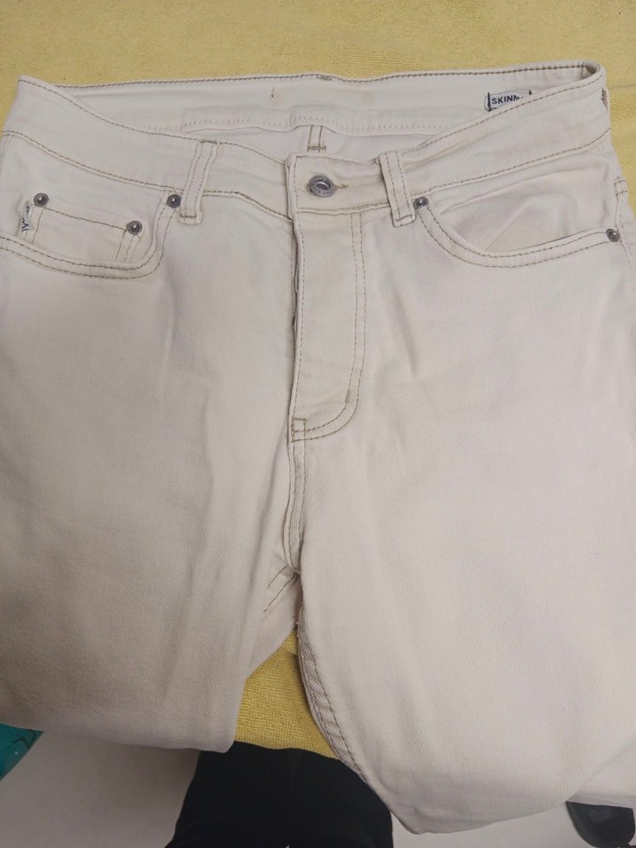 Beyaz Jean erkek kot pantolon, düğmeli ve normal boyda. Rahat kesim ve desensiz, gündelik normcore tarzda.30-31