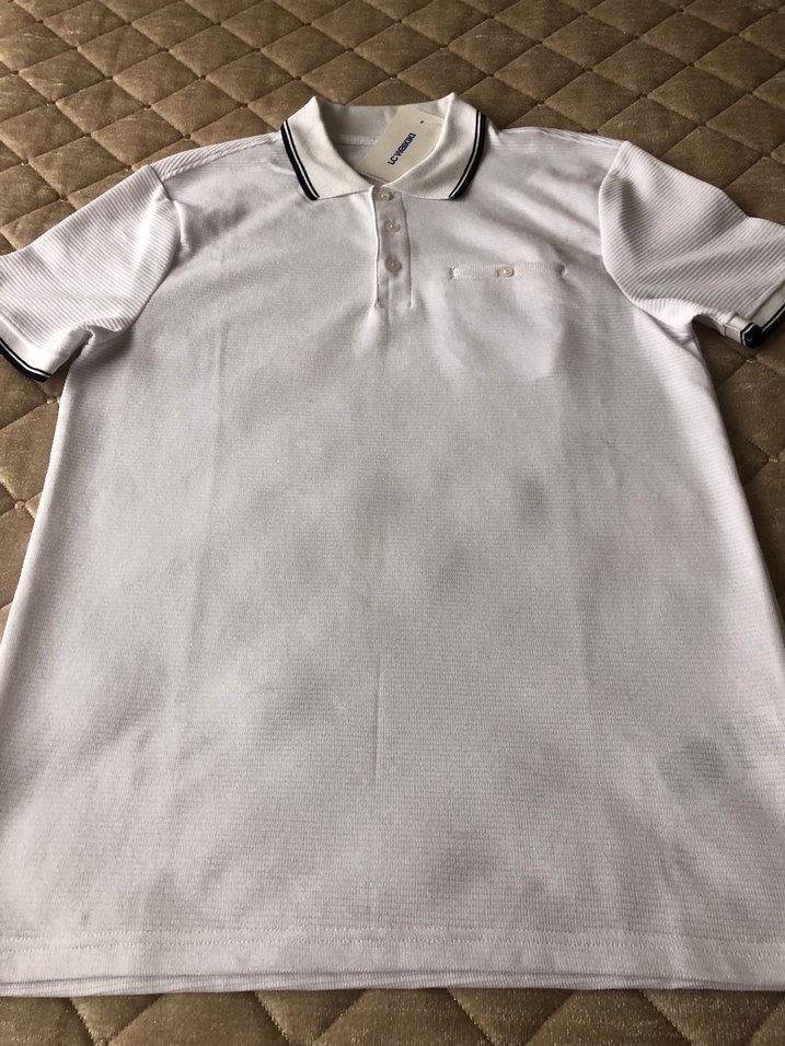Beyaz düğmeli yakalı erkek polo tişört, kısa kollu ve fitted kesim. Sentetik kumaştan, günlük rahat sokak stili için uygundur. ⚪