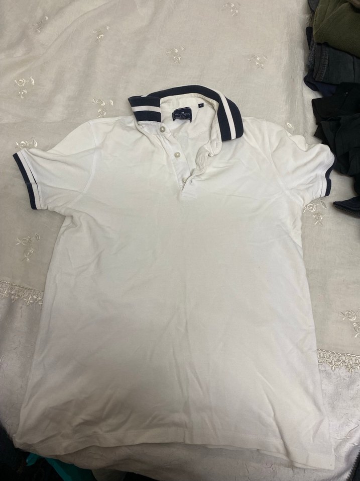 Düğmeli yakası ve kısa kollu, pamuklu kumaştan beyaz erkek polo tişört. Yaka ve kollarda gri çizgiler bulunur, rahat ve şık bir görünüm sunar.