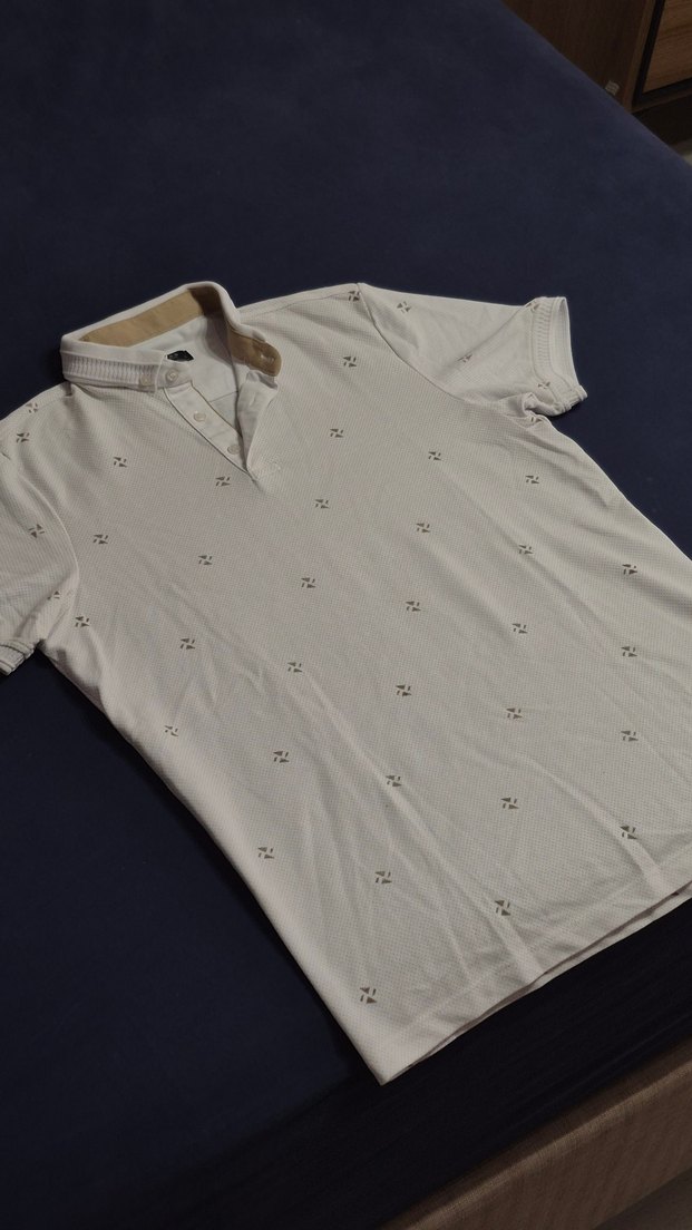 Erkekler için kısa kollu, düğmeli yakalı beyaz polo tişört. Baskılı deseni ve regular kesimiyle günlük sokak stiline uygun.