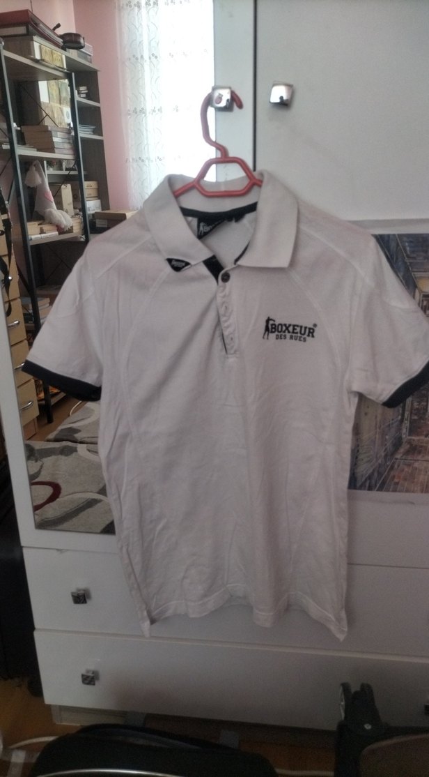 Pamuk kumaştan üretilmiş, düğmeli yakalı, kısa kollu, göğsünde baskılı logo bulunan beyaz fitted erkek polo tişört.