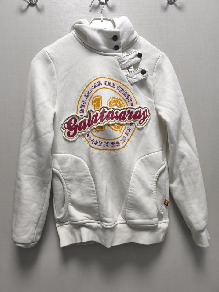 Uzun kollu, düğmeli yüksek yakalı, baskılı Galatasaray desenli beyaz sweatshirt, yumuşak ve sıcak kumaştan, günlük kullanıma uygun. makul durumda dolapta kalmaktan sararma var