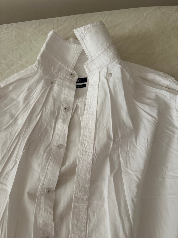Düğmeli ön kısmı, yakalı ve kısa kollu, bol kesim beyaz keten gömlek. Parlak dokusu ve günlük kullanıma uygun tarzıyla öne çıkar.
