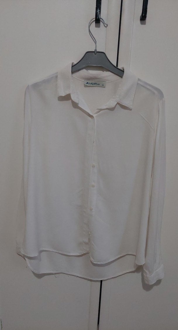 Beyaz keten gömlek, yakalı, düğmeli ve uzun kolludur. Salaş kesimi ve midi boy uzunluğu ile günlük rahat sokak stiline uygundur. Desensiz ve sade tasarıma sahiptir.