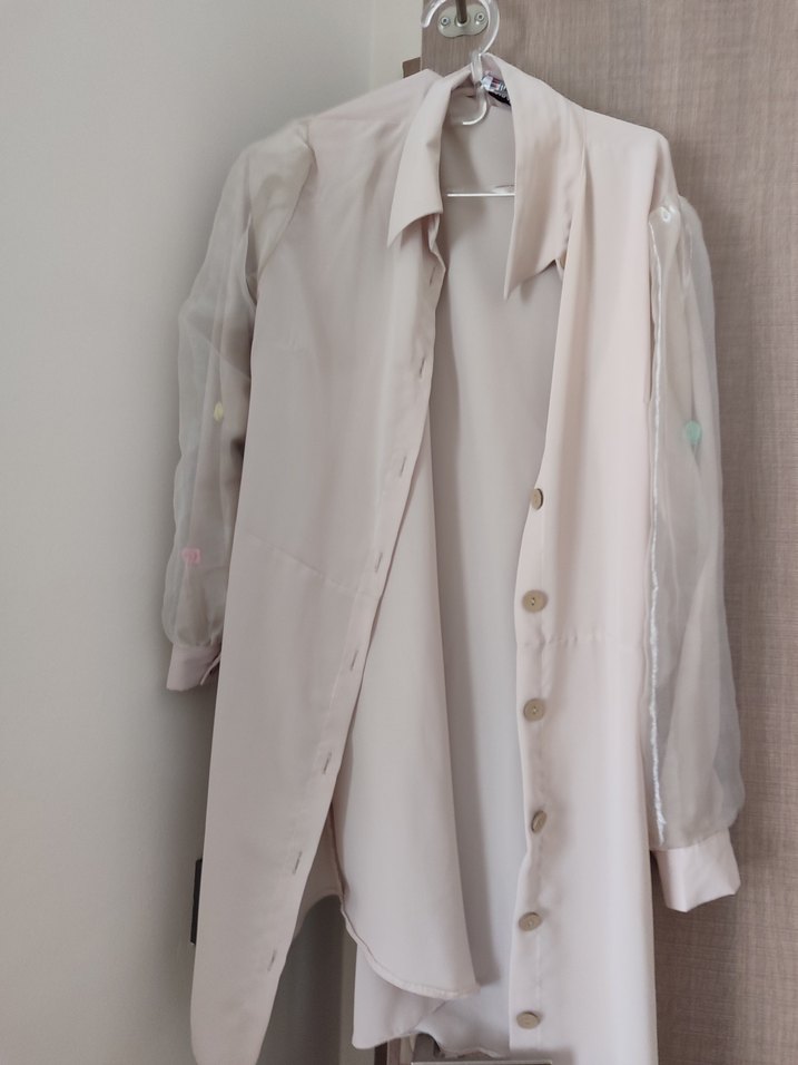 Düğmeli, uzun kollu, V yakalı, pastel beyaz renkli, ipeksi kumaştan yapılmış bol kesim hamile bluzu. Düğmeli tasarım düğünler için uygundur.