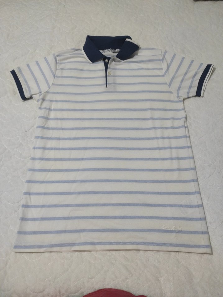 Düğmeli, kısa kollu beyaz gri çizgili erkek polo tişört. Pamuklu kumaştan, rahat ve fit kesim. Yaka ve kol uçları lacivert detaylıdır.