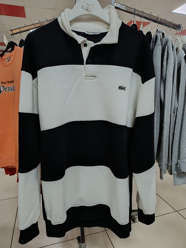 Düğmeli, uzun kollu, bisiklet yaka, beyaz ve gri çizgili erkek sweatshirt. Rahat kesimli, yumuşak ve sıcak kumaştan üretilmiştir.