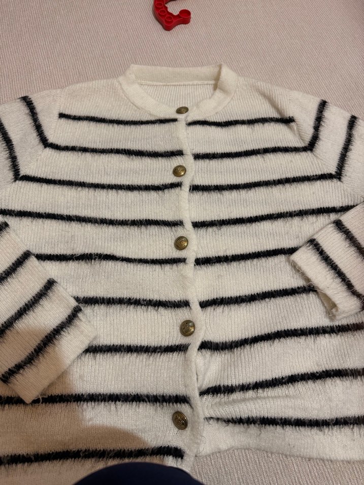 Yumuşak örme kumaştan yapılmış, düğmeli, uzun kollu, beyaz zemin üzerine gri çizgili, salaş kesim kadın hırka. Günlük kullanıma uygundur.