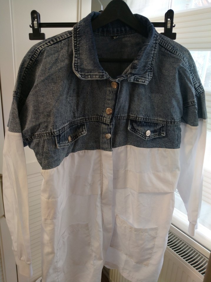 Düğmeli önü ve bol kesimiyle kadın midi uzunluğunda beyaz ve gri denim ceket. Uzun kollu, yakası kesik ve gündelik sokak stiline uygun.