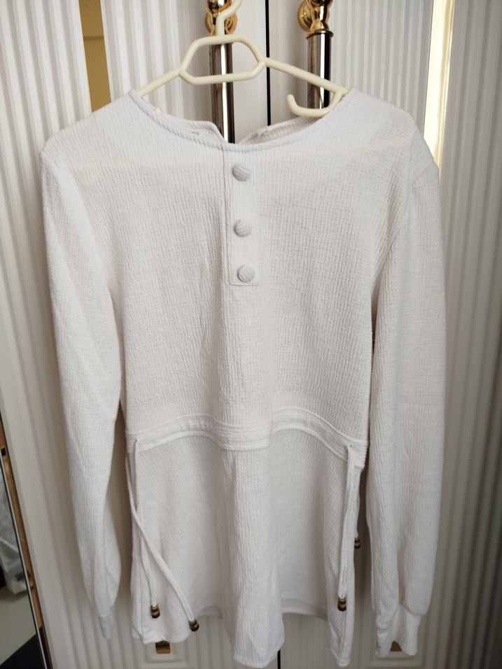 Yumuşak keten kumaştan yapılmış beyaz, uzun kollu hamile bluzu. Ön kısmında düğme detayları ve rahat bir kalıp bulunur. Normal midi boyda, minimalist tasarıma sahiptir.