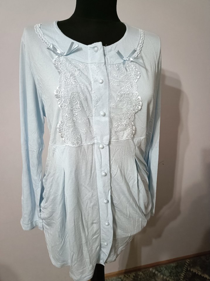 Pamuklu, uzun kollu, düğmeli beyaz hamile bluzu. Vintage dantel detaylı, yuvarlak yakalı, günlük kullanıma uygun rahat kesim.