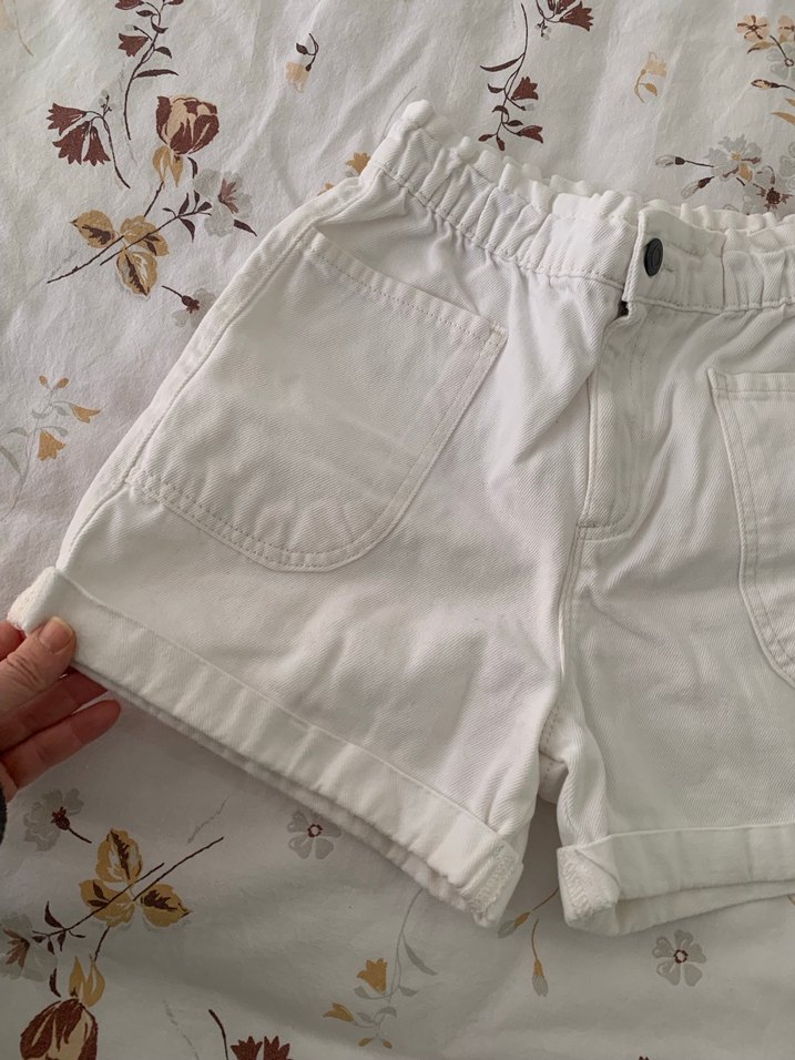 Yumuşak pamuktan, düğmeli ve büyük cepli beyaz hamile midi şort. Rahat kesimi ve sokak stiline uygun tasarımıyla günlük kullanıma uygundur.