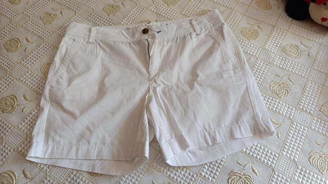 Düğmeli beyaz pamuk hamile mini şort, kısa boy ve regular fit. Günlük kullanım için sade, bohem tarzda rahat bir şort.