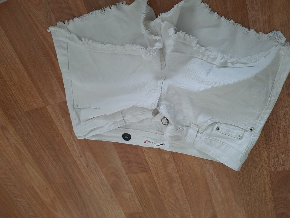 Düğmeli, bol kesim beyaz hamile mini şort. Pamuklu kumaştan, rahat ve günlük sokak giyimine uygun.