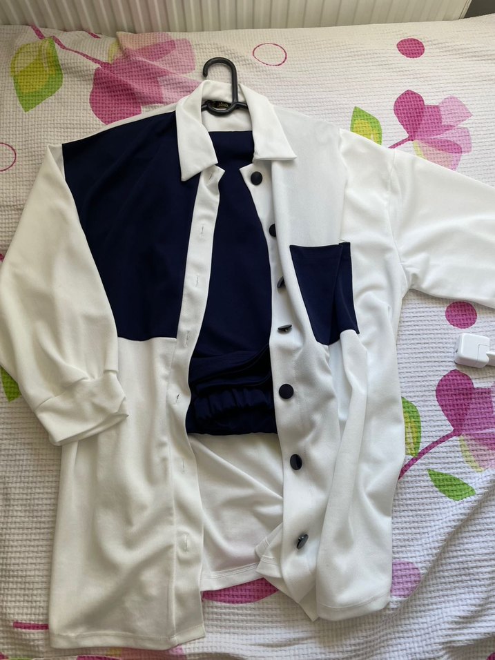 Düğmeli ön kısmı ve kesik yakasıyla beyaz kadın gömlek. Uzun kollu ikili takım pantolon hiç kullanılmadı gömlek 2 defa kullanıldı marka temsili
