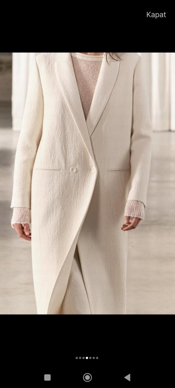Dokulu kumaştan üretilmiş, düğmeli beyaz kaban. Ön cepleri ve uzun kesimiyle sade ve şık bir görünüme sahiptir. ❄️