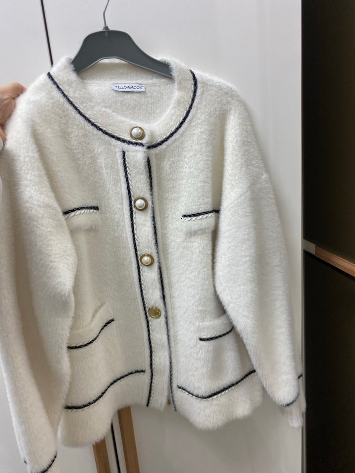 Uzun kollu, yuvarlak yakalı beyaz angora hırka, düğmeli ve siyah şerit detaylıdır. Rahat kesimi ve normal uzunluğu ile şık ve ister günlük ister özel günler için uygundur.