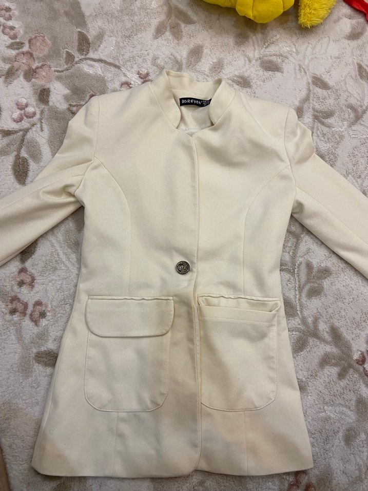 Düğmeli, beyaz kadın blazer. Notlu yaka ve uzun kollu, sentetik kumaştan üretilmiş. Ofis ve günlük kullanıma uygun, rahat kesim.