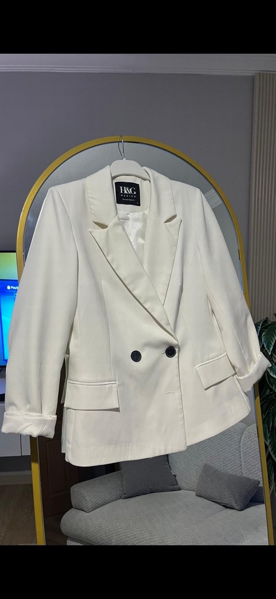 Düğmeli, beyaz renkli kadın blazer ceket, kısa kesim ve uzun kolludur. Ofis ve günlük sokak stiline uygundur, sentetik kumaştan üretilmiştir.