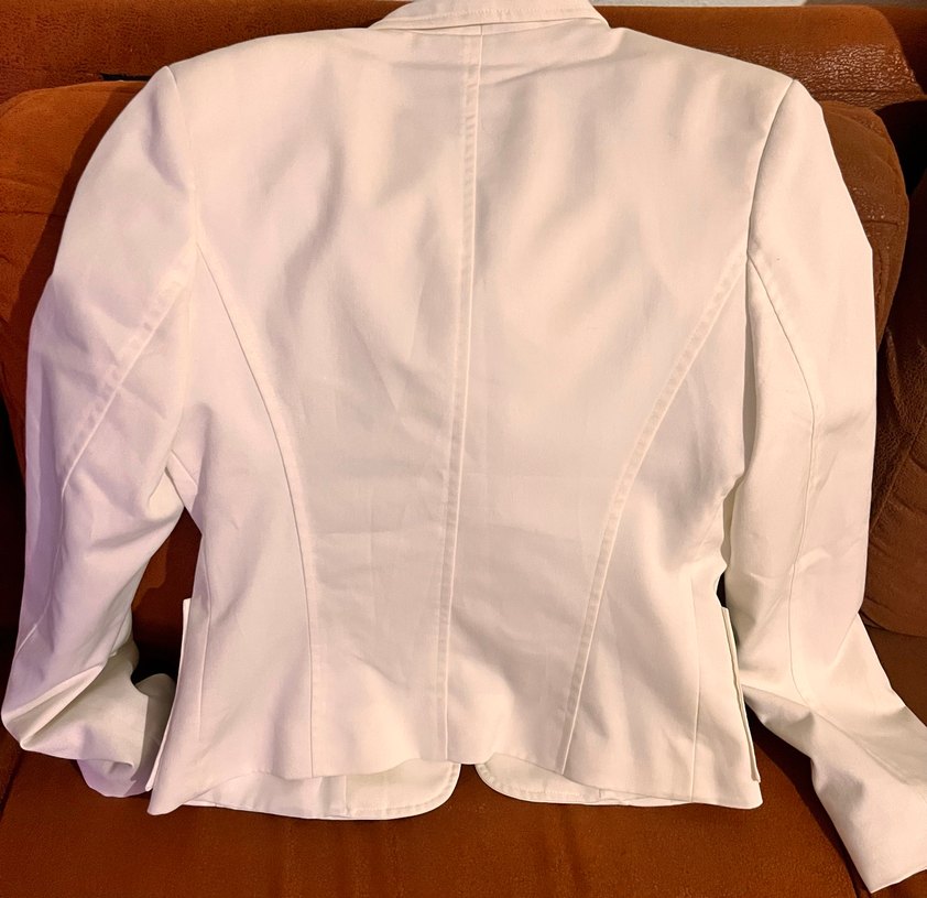Düğmeli, yakalı ve uzun kollu beyaz kadın blazer ceket, parlak ve ipeksi kumaştan, ofis ve sokak stili için uygundur. ✨