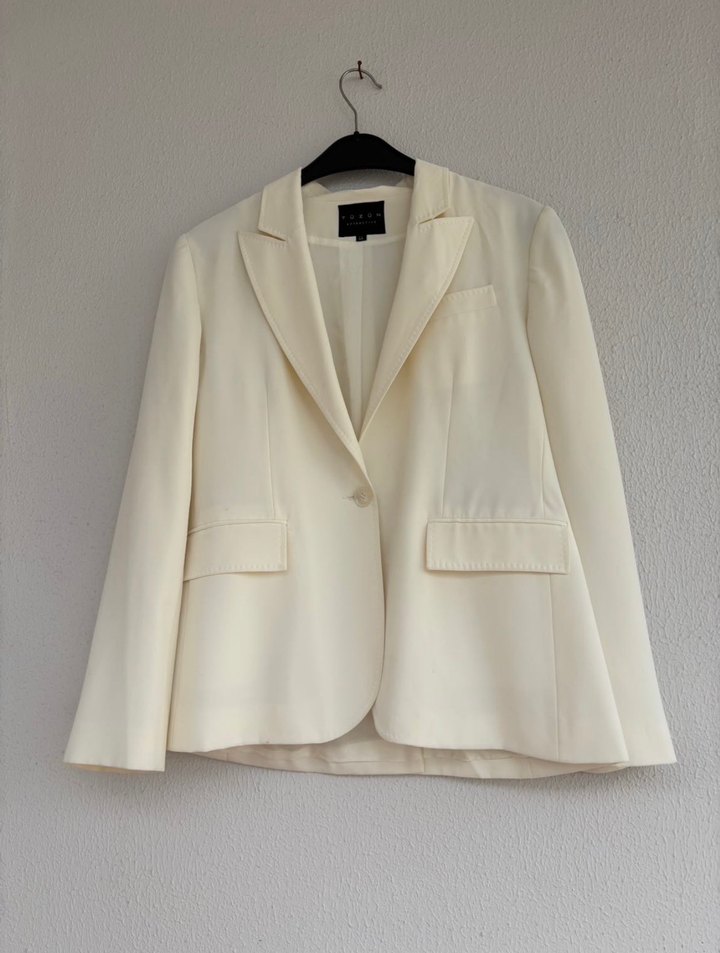 Düğmeli, beyaz, uzun kollu kadın blazer ceket. Notlu yaka ve normal kesime sahip, ipeksi dokulu, modern klasik tarzda, ofis için uygun midi boyda.