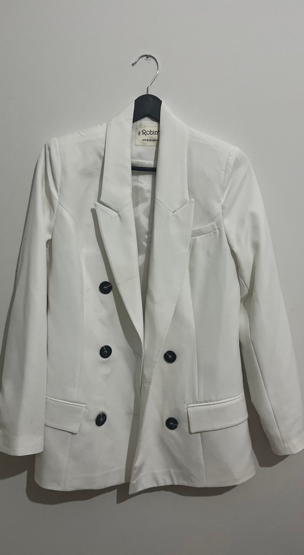 Beyaz renkli, düğmeli ön kısmı ve kesimli yakası olan kadın blazer ceket. Uzun kollu, midi boy ve regular fit tasarıma sahiptir. Ofis için uygun, sentetik kumaştan üretilmiştir.